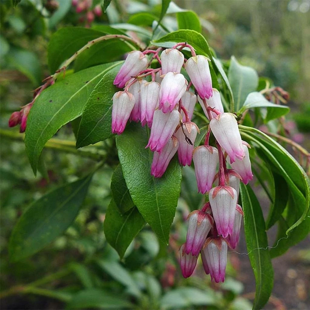 Le Pieris japonica, appelé plus communément Andromède du Japon, est originaire de l’est de Chine, du Japon, et de Taïwan. Il appartient à la famille des éricacées, c’est un cousin des bruyères et des camélias avec lequel il forme de très beaux massifs. Le cultivar ‘Christmas Cheer est une superbe obtention japonaise datant de 1967. Cet arbuste possède un port buissonnant, sa croissance est plutôt lente, et il mesure à maturité, au bout de 10 ans, environ 1.50m de hauteur pour 1m d’envergure. Il est doté d’un beau feuillage persistant en hiver, composé de longues feuilles brillantes, lancéolées et pointues, légèrement dentées en bordure, mesurant jusqu’à 10 cm de long. Les jeunes pousses sont rougeâtres, puis les feuilles deviennent vert clair, et enfin vert foncé. Les grappes de boutons floraux, d’un vieux rose foncé, apparaissent en hiver, renforçant l’effet décoratif de cet Andromède du Japon à la morne saison. En avril, il se couvre d’une multitude de grappes dressées à extrémité retombante, de 10 à 15 cm de long, composées de petites fleurs en forme d’urnes, passant du rose carminé au blanc-crème, évoquant des fleurs de muguet. Mellifères, les fleurs exhalent un doux parfum de miel et sont très visitées par les abeilles.