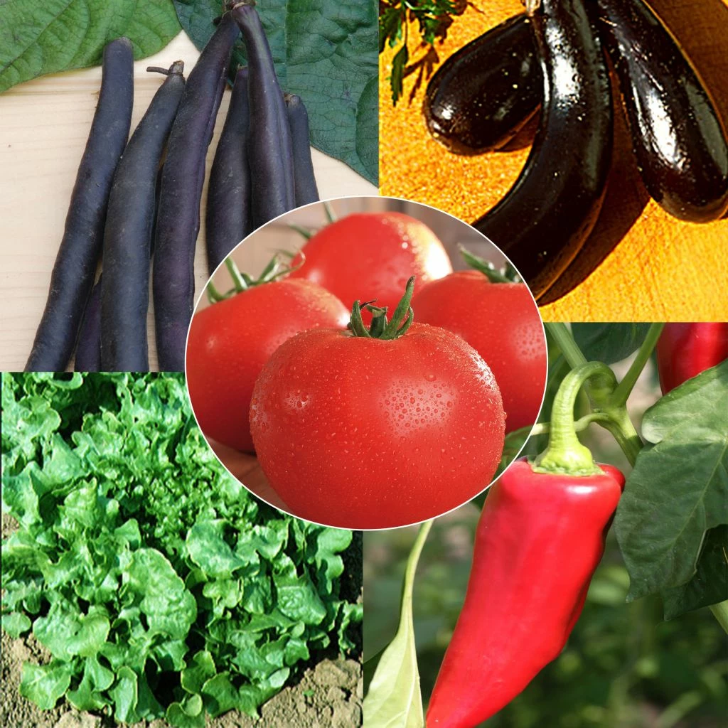Collection de 5 sachets de graines issues de l’agriculture biologique. Composé de : 1x Aubergine très hâtive de Barbentane 1x Haricot nain mangetout Purple Queen 1x Chicorée scarole Nuance 1x Poivron Petit Marsellais 1x Tomate Burpee Delicious
