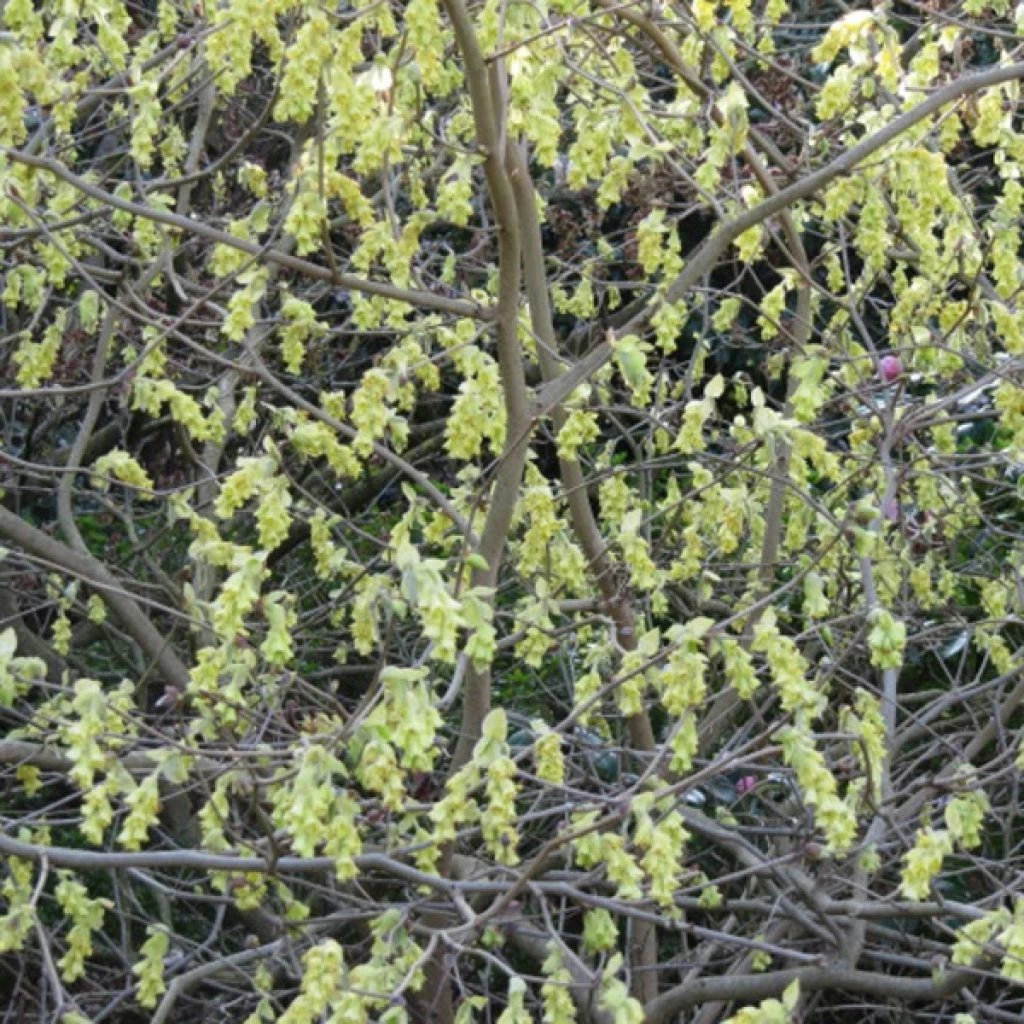 Originaire principalement du Japon, le Corylopsis ou faux noisetier, est un petit arbuste rustique qui développe un port très évasé de 2 m de hauteur. Ses feuilles caduques, alternes, ovales, de 4 à 10 cm de long, vert foncé se parent d’or en automne. Les fleurs en grappes pendantes, jaune vif aux anthères rouge pourpré, de 8 à 12 cm de long, au puissant parfum, apparaissent souvent avant le feuillage.