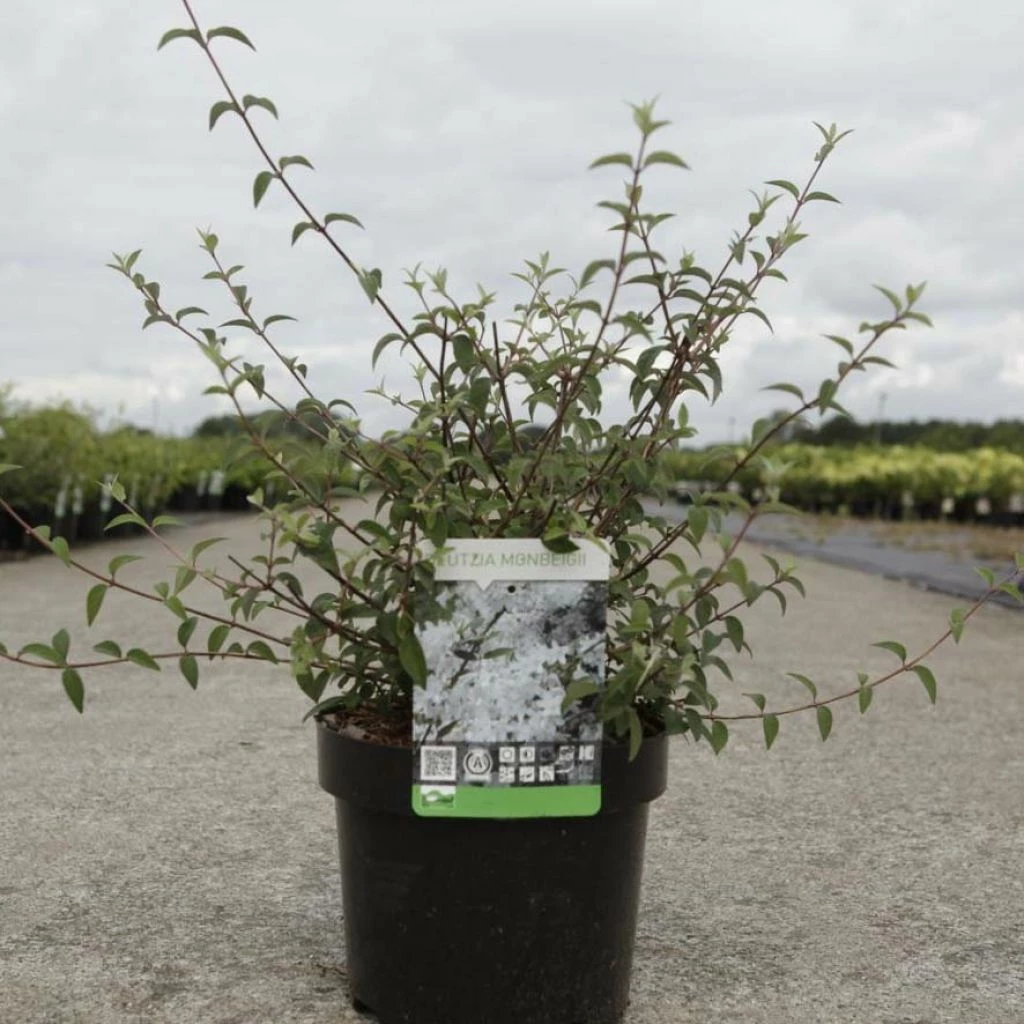 Le Deutzia monbeigii est une espece de deutzie formant un arbuste caduc de petite taille et offrant de mai à juillet, une profusion des corymbes de fleurs étoilées simples, blanc pur aux étamines jaune d’or bien apparentes ! Il est doté du même port naturel élégant avec ces rameaux érigés puis retombants et de la même croissance rapide qu’on retrouve chez les autres espèces du genre. Il se distingue notamment par ses jeunes pousses rouge brun et ses petites feuilles aux marges finement dentées et leur coloris vert foncé au revers blanc. C’est un arbuste polyvalent qu’il convient d’utiliser en isolé, en petite haie libre, en bordure ou en massif avec d’autres espèces plus fleurie. Parfaitement rustique, elle s’adapte au soleil comme à mi-ombre et tolère tous les sols du moment qu’ils sont fertiles, frais et profonds.