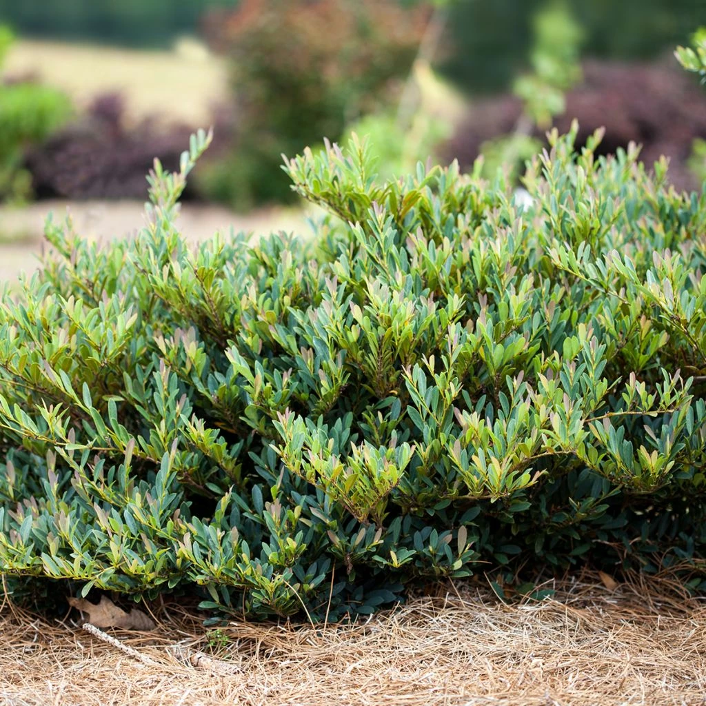 C’est le cas de Cinnamon Girl ®, une variété récente de ma gamme Firts Editions ® à petites feuilles réputée comme la plus rustique de toutes puisque capable de résister à des froids de l’ordre de -15°C à -17°C. Cette bonne résistance au gel permet de la planter sans crainte dans la majeure partie de la France. Cet arbuste bas mesurant 60 à 90 cm de hauteur maximum, pour un étalement de 90 à 120 cm, constitue des touffes très denses, pouvant jouer le rôle de couvre-sol en plantation de talus, où il limitera l’érosion. Son feuillage est constitué de petites feuilles elliptiques lancéolées, coriaces et persistantes. Il est particulièrement intéressant au printemps, les jeunes pousses prenant une teinte pourprée, proche de la couleur des prunes, ce qui est très distingué sur le feuillage ancien vert bleuté.