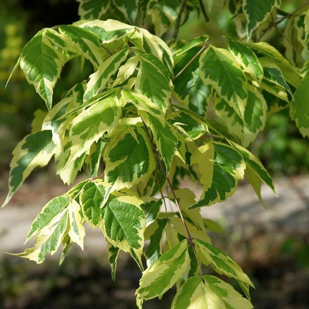 L’Acer negundo ‘Aureovariegatum’ est une autre variété d’érable à feuilles de frêne panachées, mais celui-ci présente des feuilles largement et aléatoirement marginées de jaune vif à jaune crème, parfois teinté de rose sur les jeunes pousses. Il est également intéressant pour son port souple, son jeune bois presque blanc et son développement un peu moins important que celui de l’espèce type. C’est un arbre très décoratif du printemps à l’automne : installez-le bien en vue dans le jardin et n’hésitez pas à le tailler pour qu’il produise des jeunes pousses colorées. Ce merveilleux érable s’installera de préférence à mi-ombre, pour épargner son feuillage des brûlures du soleil.