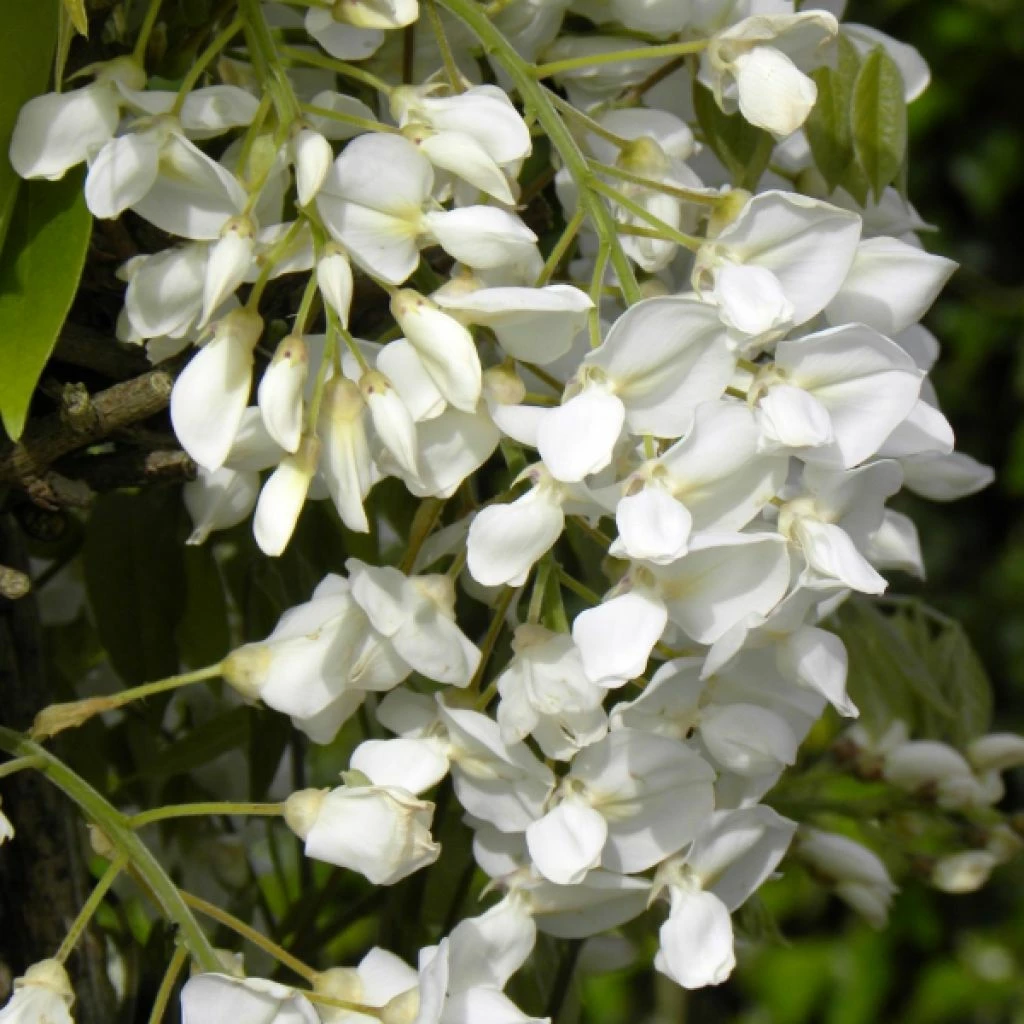 La Wisteria venusta ‘Alba’ est une Glycine japonaise, grimpante, rustique, appréciée pour sa généreuse floraison en courtes grappes blanc ivoire et parfumées. C’est la moins vigoureuse des Glycines, idéale pour les petits espaces.
