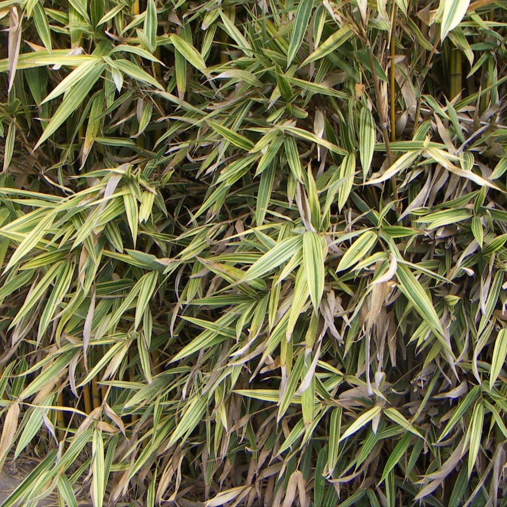 L’Hibanobambusa tranquillans Shiroshima est sans doute l‘un des plus beaux petits bambous à feuillage panaché, ses longues feuilles vert clair fortement striées de blanc-crème sont aussi éclatantes que lumineuses tout au long de l’année. De stature modeste, dressé mais buissonnant et très dense, ce bambou cumule les qualités de ses deux parents, alliant le beau feuillage du Sasa aux cannes plus épaisses du Phyllostachys. Résistant au froid, tolérant la sécheresse et indifférent à l’exposition, il est facile à cultiver dans toutes nos régions. ‘Shiroshima’ permet de créer une haie brise-vue ou brise-vent aussi belle qu’efficace et ne démérite pas en touffe isolée dans un petit jardin. Son caractère traçant nécessite toutefois la mise en place d’une barrière anti-rhizomes.