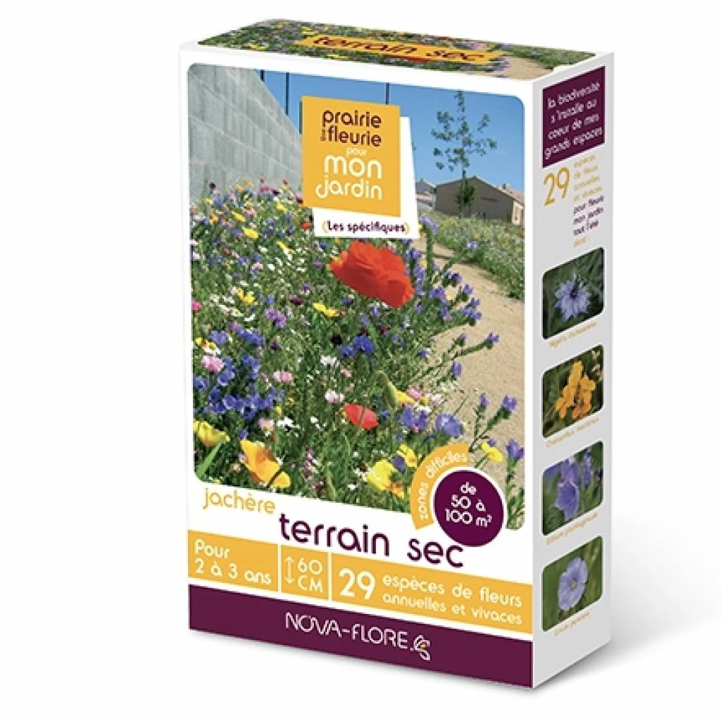 Cette Jachère Terrain sec, qui rassemble des fleurs sélectionnées pour leur tolérance à la sécheresse estivale, est idéale pour embellir les terres ingrates. Robustes et peu exigeantes, elles poussent sans soin dans tout type de sol et offrent une très belle floraison dès la première année, tout en créant un refuge naturel pour de nombreux insectes auxiliaires. On sèmera les graines directement en place, à la volée, en fin d’été ou au printemps, au soleil, dans un sol bien préparé. La jachère ainsi créée fleurira pendant plusieurs années, du printemps à l’été.
