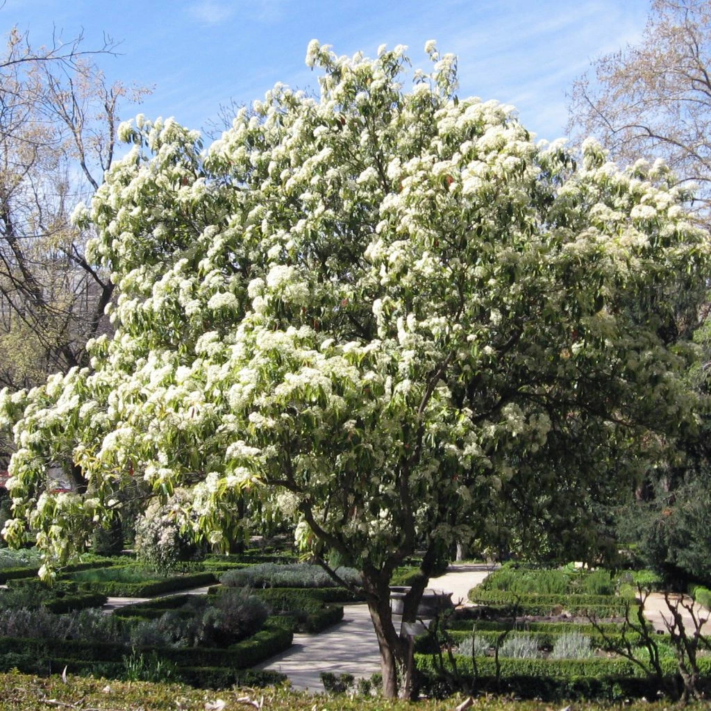 Ce petit arbre ou grand arbuste à feuilles persistantes, au port buissonnant et à la croissance rapide, présente une végétation touffue, une couronne étalée, ainsi qu’une écorce grise, rouge brun à maturité, s’exfoliant. Communément appelé Photinia chinois, il est originaire de Chine et du Japon, et appartient à la famille des Rosacées. Il est doté d’un feuillage hautement décoratif, composé de grandes feuilles, de 10 à 20 cm de long, ovales, dentelées, coriaces et lustrées, vert foncé, magnifiquement teintées de rose-bronze au printemps. A l’automne et en hiver, un certain nombre de feuilles prennent de belles teintes rougeâtres. Ses petites fleurs blanches, réunies en panicules corymbiformes plates, de 10 à 20 cm de diamètre, s’épanouissent d’avril à juin, et sont suivies, en automne, de petits fruits sphériques, d’abord verts, puis rouges, et enfin brun-violet. Il mesure environ 4 à 6 m de haut, pour une envergure de 2 à 3 m.
