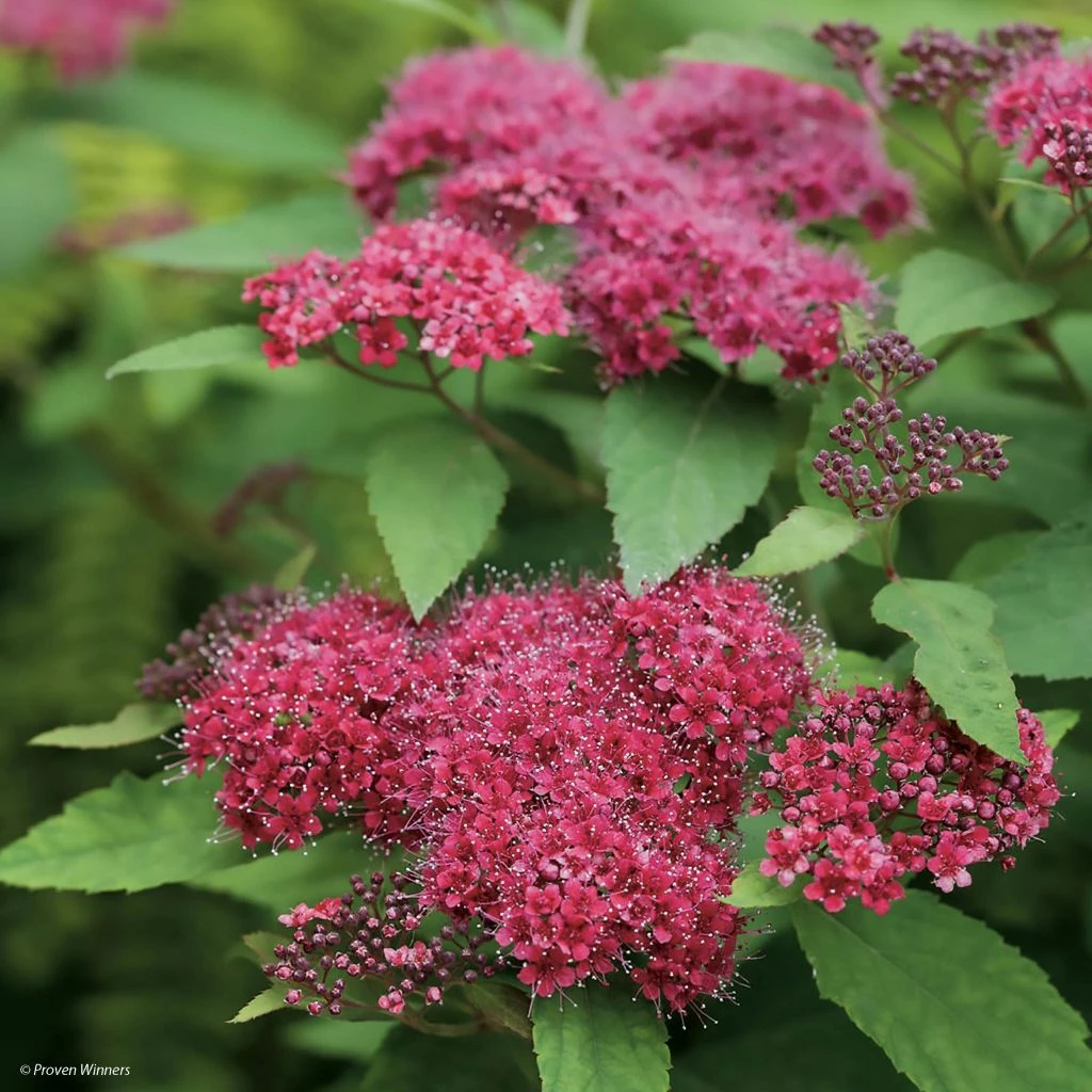 La Spiraea japonica ‘Double Play Red’ est une variété récente de spirée japonaise, un petit arbuste rond et compact, multicolore et au feuillage changeant, doté d’une floraison rouge cramoisi, le rouge le plus sombre jamais observé chez ce type de spirées. Ses jeunes pousses teintées de pourpre à l’ouverture se colorent d’orange au printemps, deviennent vert bleuté en été sous de grandes corymbes rouge soutenu, puis virent au jaune d’or à l’automne. Peu exigeant, cet adorable petit buisson trouvera sa place dans tous les jardins. Son port compact et arrondi la destine à la réalisation de bordures ou de massifs bas, à la culture en bacs ou jardinières. Il s’adaptera à tous les climats, à tous les sols mais redoute les situations brûlantes ou trop arides.