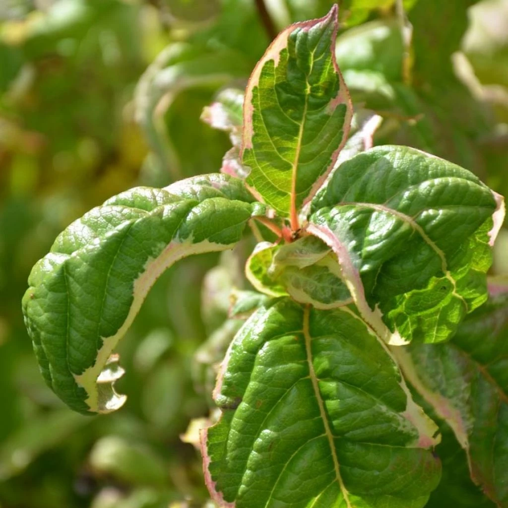 La variété ‘Caricature’ est issue de cette espèce : elle se distingue par son feuillage très gaufré, comme recroquevillé, parfois crispé. La marge des feuilles est panachée de blanc-crème, et prend souvent des tons rosés au cours de la saison. Si certains la qualifieront certainement volontiers d’étrange ou d’insolite, d’autres la trouveront probablement charmante et intrigante ! Ce qui est certain, c’est qu’elle ne passera pas inaperçu dans votre jardin et incitera à la discussion. Entre fin avril et fin mai / début juin, elle produit des fleurs en trompette, blanc pur en boutons, puis de plus en plus roses à mesure qu’elles s’ouvrent. Comme toutes ne s’ouvrent pas en même temps, on obtient fréquemment un effet bicolore très attrayant. Selon le temps, ‘Caricature’ remonte parfois en septembre. Compacte, elle ne dépassera guère 1,50 m de haut pour 1 m de large.